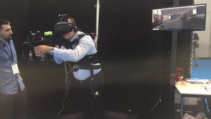 There's even — courtesy of one French startup with an eager young CEO — a walk-on virtual reality simulator, which includes a small bowl you can run in and a converted assault rifle. This, the brochure says, is designed for "apex soldiers and police officers" to simulate countering a Paris 2015-style terrorist attack.